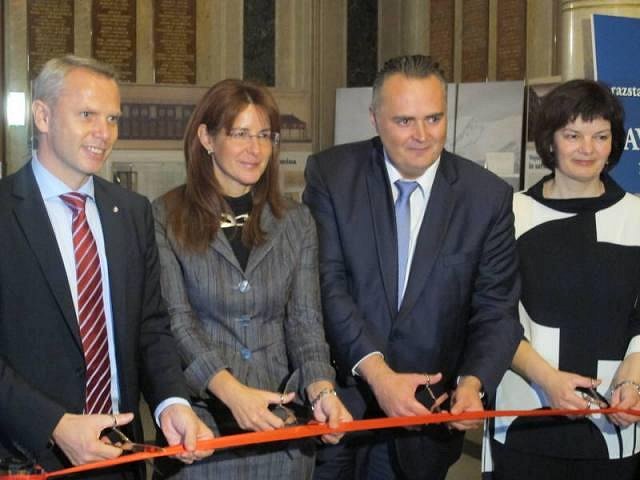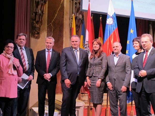 One day later, on November 4, the Slovenian Embassy in Austria and the Municipality of Bruck an der Leitha opened the exhibition about a former refugee camp in this town, only 40 km from VIenna. Bruck an der Leitha is located next to the Austrian national border with Hungary and Slovakia where a large refugee camp was established during World War I. Between 1915 and 1918, there were approximately 5,000 refugees from Slovenia and especially the Soča Valley living in this camp, which is why this place also received a Slovenian name Bruck na Litvi even though it is located in the immediate vicinity of Vienna. At the place where barracks with refugees used to stand you can find a memorial in memory of 483 refugees from the municipalities in the Soča Valley who lost their lives here. Representatives of Austria and the Republic of Slovenia laid wreaths to the memorial, whilst the singers of the Simon Gregorčič Octet prepared a short programme. Besides the eminent representatives of Austria and the Republic of Slovenia, who already attended the opening of the Javorca exhibition in Vienna, the opening of the exhibition in the city hall was also attended by the President of the Lower-Austria Regional Parliament, Mr. Erwin Pröll Ph.D. The exhibition presents the construction and particularly the life of refugees in the camp. The displayed registry of births and deaths which the refugees kept shows that there were a lot of refugees from the villages in the immediate vicinity of Tolmin living in this camp.
